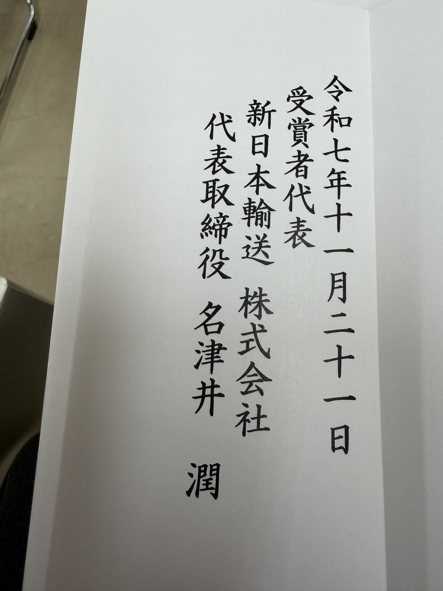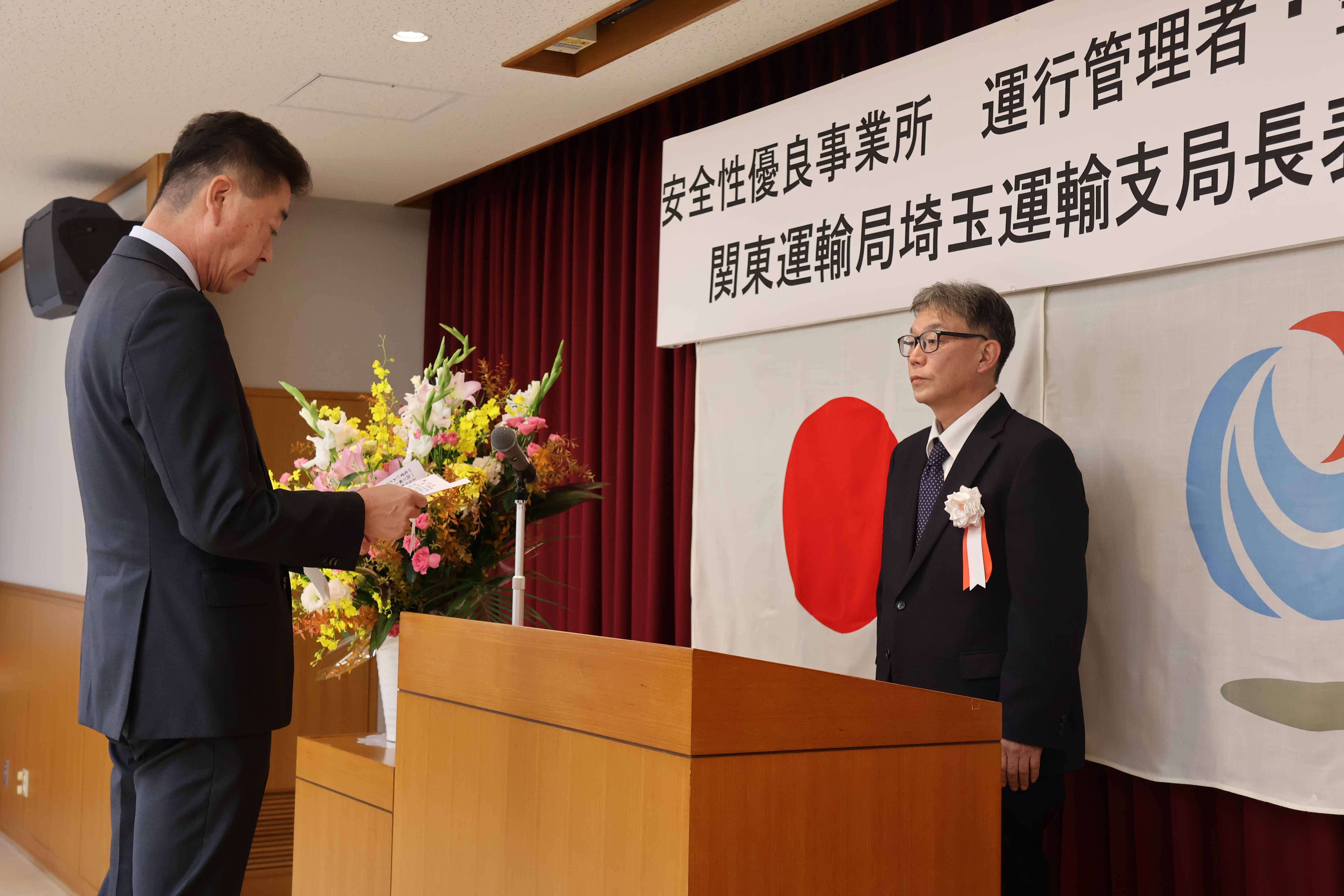 11月21日 「安全性優良事業者」として関東運輸局埼玉支局長より表彰を受け、更に弊社が代表して謝辞をさせて頂きました。従業員の安全に対する評価が今回の表彰につながりました。